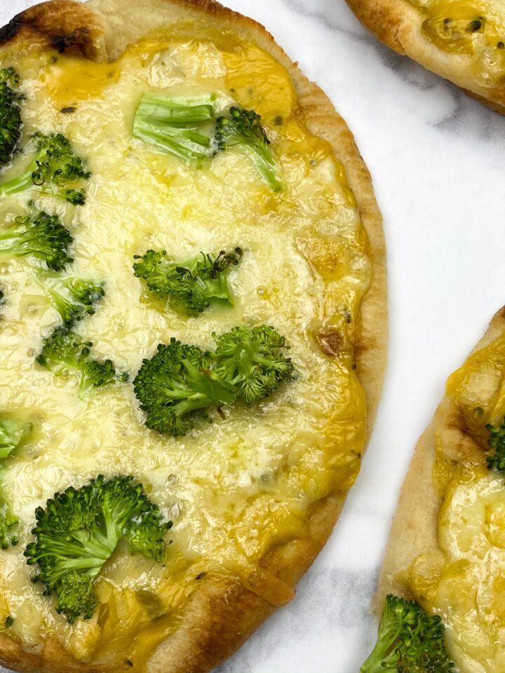 A quick broccoli and cheese naan pizza that is a great addition to any busy day!