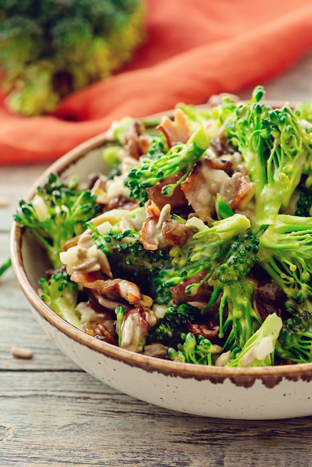 Broccoli Bacon Salad Danielle GreenJuly 05, 2019 33 Broccoli Bacon Salad is an easy side dish made with raw broccoli, bacon, raisins, sunflower seeds and a mayonnaise vinegar dressing. This traditional recipe is versatile enough for summer cookouts or a holiday dinner table!see full recipeSee the full directions on my site