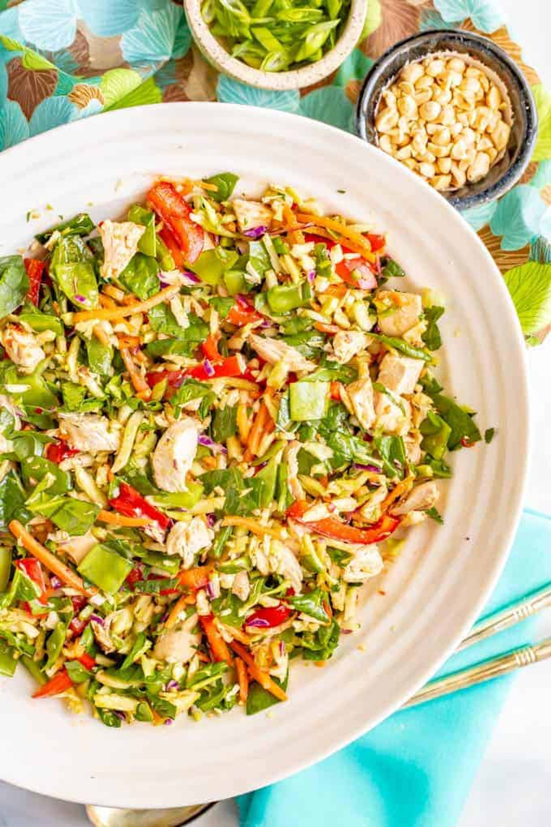 Broccoli slaw chicken salad with soy-ginger dressing is full of fresh veggies and is crazy crunchy! It’s a great salad to meal prep for a healthy lunch!