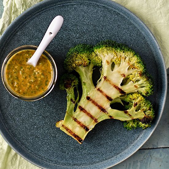 Chargrilling the broccoli "steak" gives it a lovely taste and appearance. I used a griddle pan for this recipe, but you could cook your broccoli steaks on a barbecue.