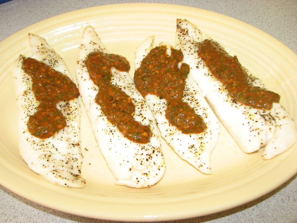 After the fish is cooked, spoon 1/4 chermoula sauce over each piece and serve.