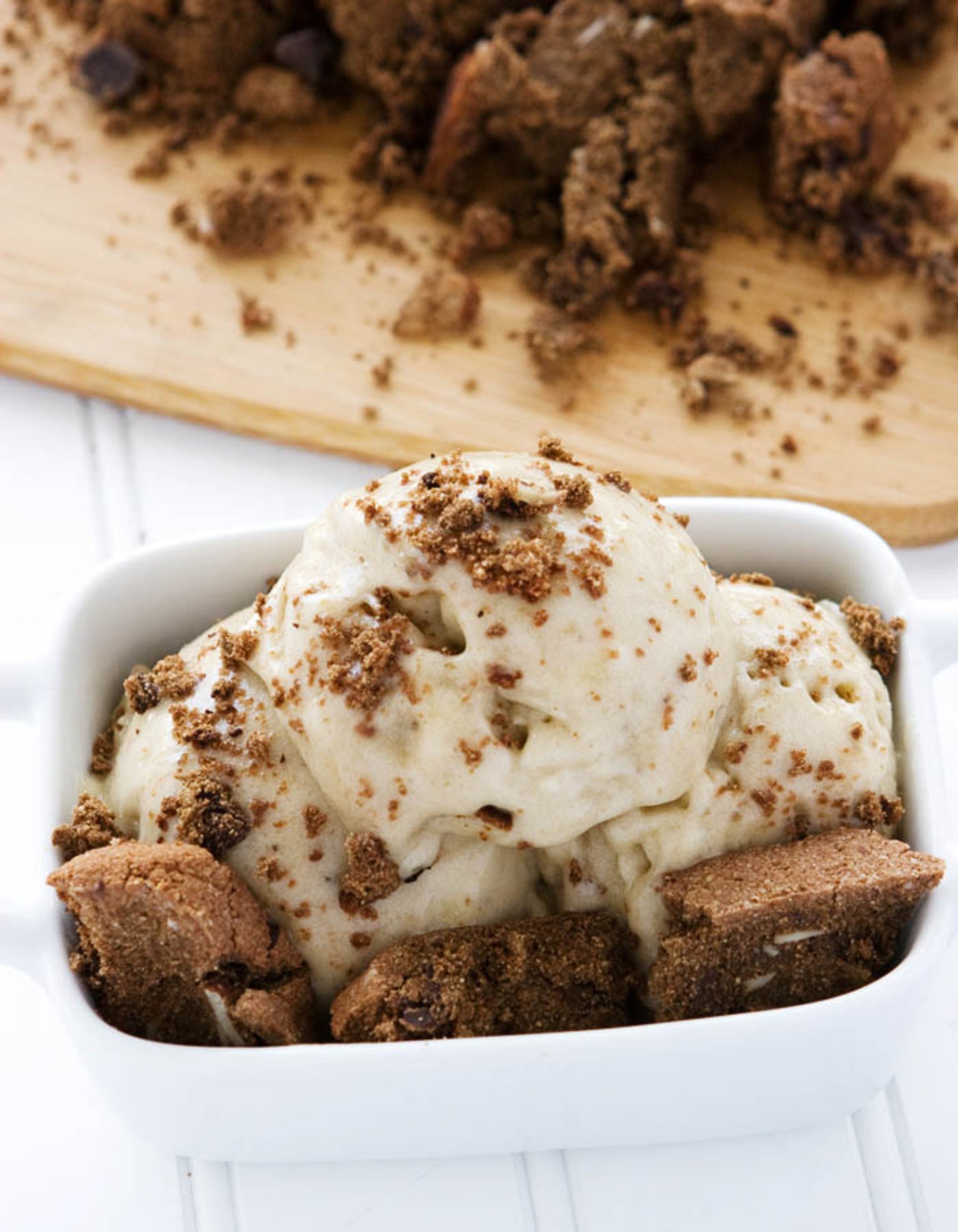 Double chocolate gluten free biscotti pieces in a creamy vanilla vegan ice cream.