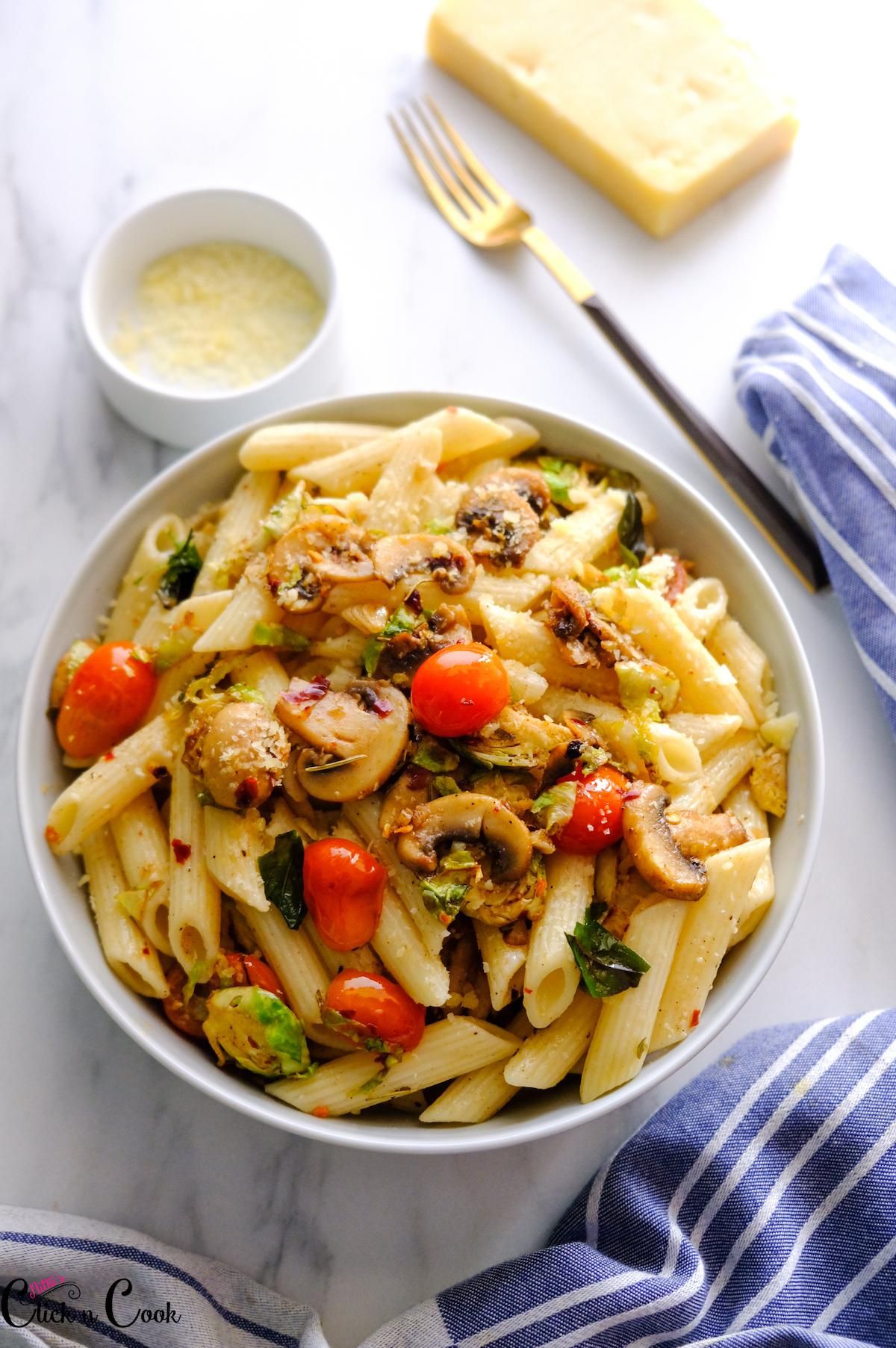 Brown Butter Brussel sprouts Pasta – The browned butter pasta is tossed with mushroom, cherry tomato, and drizzled with aromatic Nutty Browned butter!