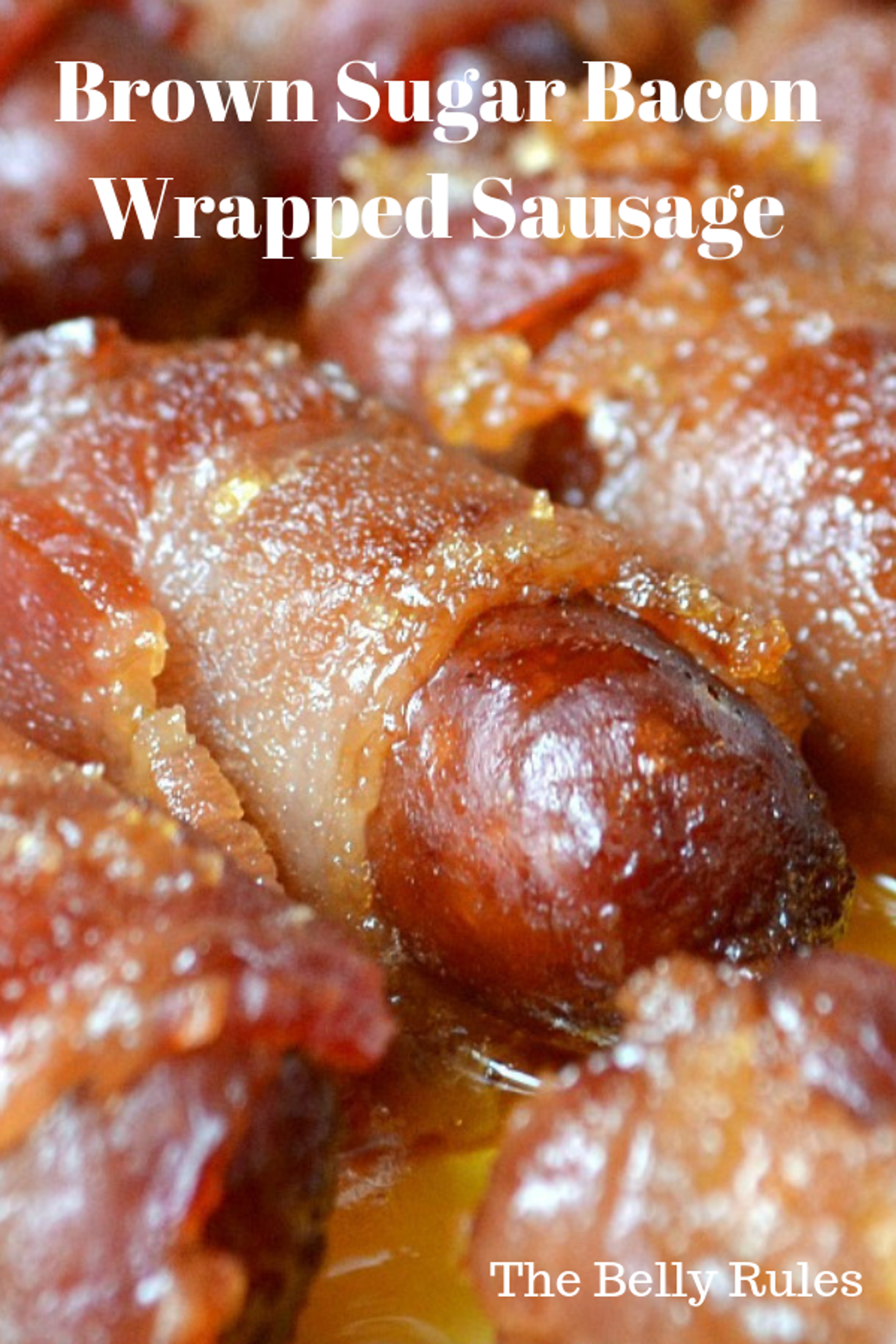 Preheat oven to 350 degrees. Cut strips of bacon into thirds. Wrap each little sausage with a piece of bacon and place seam side down in a glass baking dish. Sprinkle brown sugar over the sausages and...