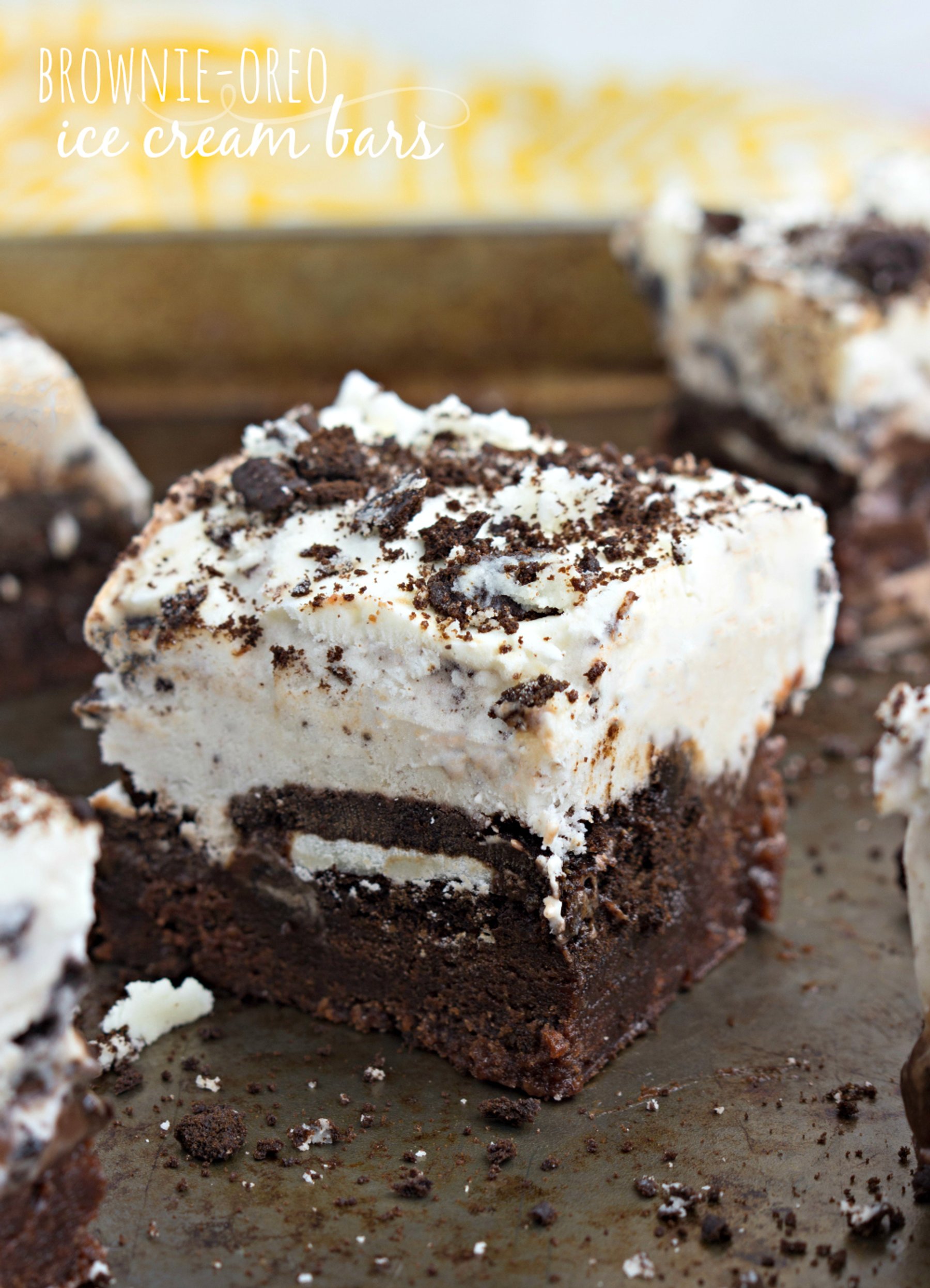 Super easy and delicious brownie ice cream bars with hot fudge, oreos, and cookies and cream ice cream
