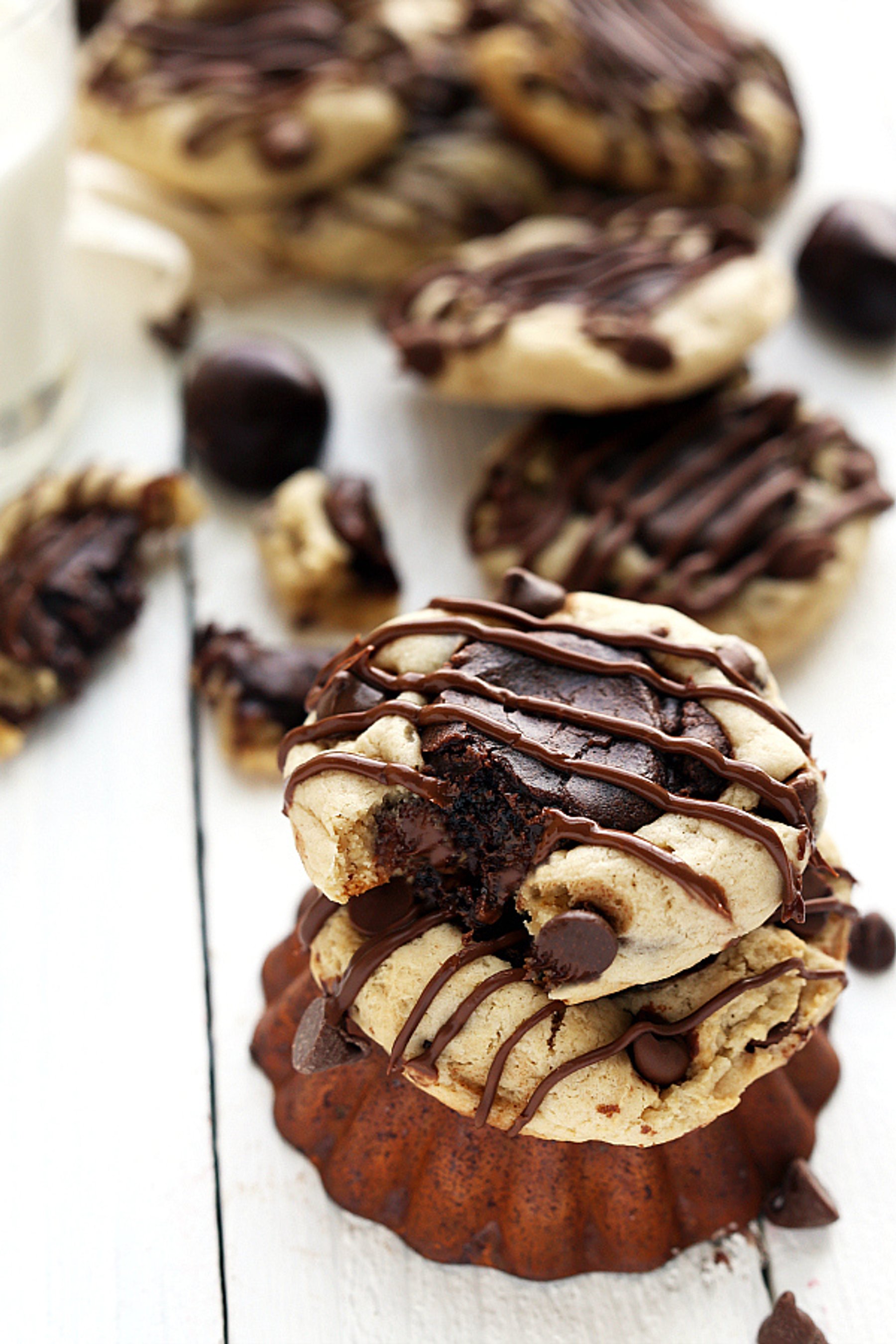 These delicious cookies are easy to make and the best possible twist on a thumbprint cookie with a chocolate chip base and chocolate drizzle.