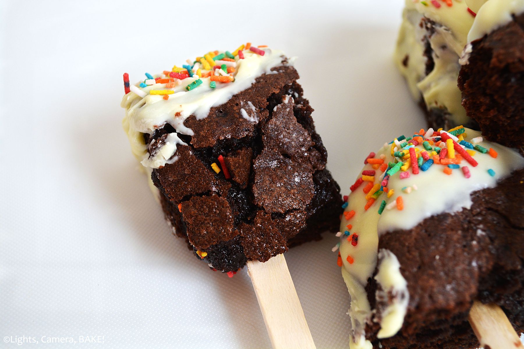 These are thick and fudgy chocolate brownies baked and put on a wood lollipop stick and dipped in white chocolate and covered in sprinkles.