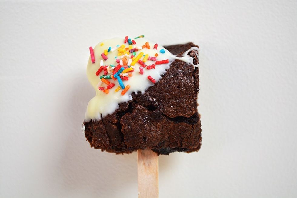 These are thick and fudgy chocolate brownies baked and put on a wood lollipop stick and dipped in white chocolate and covered in sprinkles.