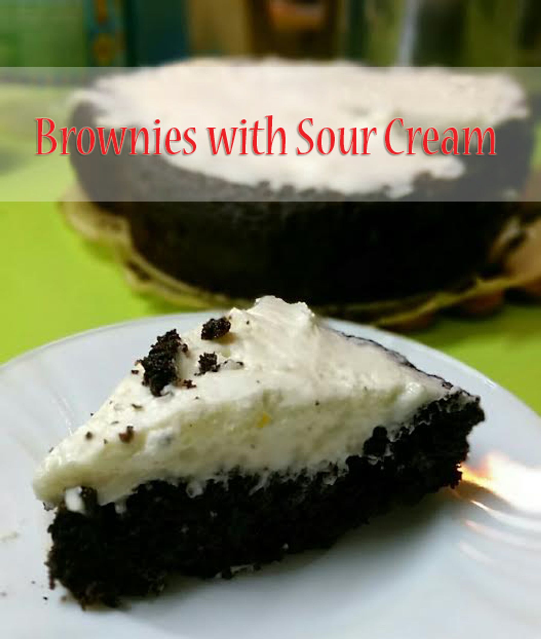 While brownies baked, whisk the sour cream with sugar. It is better to do it with a stationary mixer, because it will take a lot of time until it gets thick. When the brownies are cooled down, spread cream on the top.