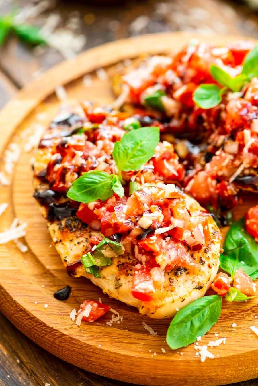 Bruschetta Chicken is a delicious, healthy dinner recipe! Seasoned and grilled chicken topped with homemade bruschetta and balsamic glaze! It's an easy dinner perfect for a busy weeknight.