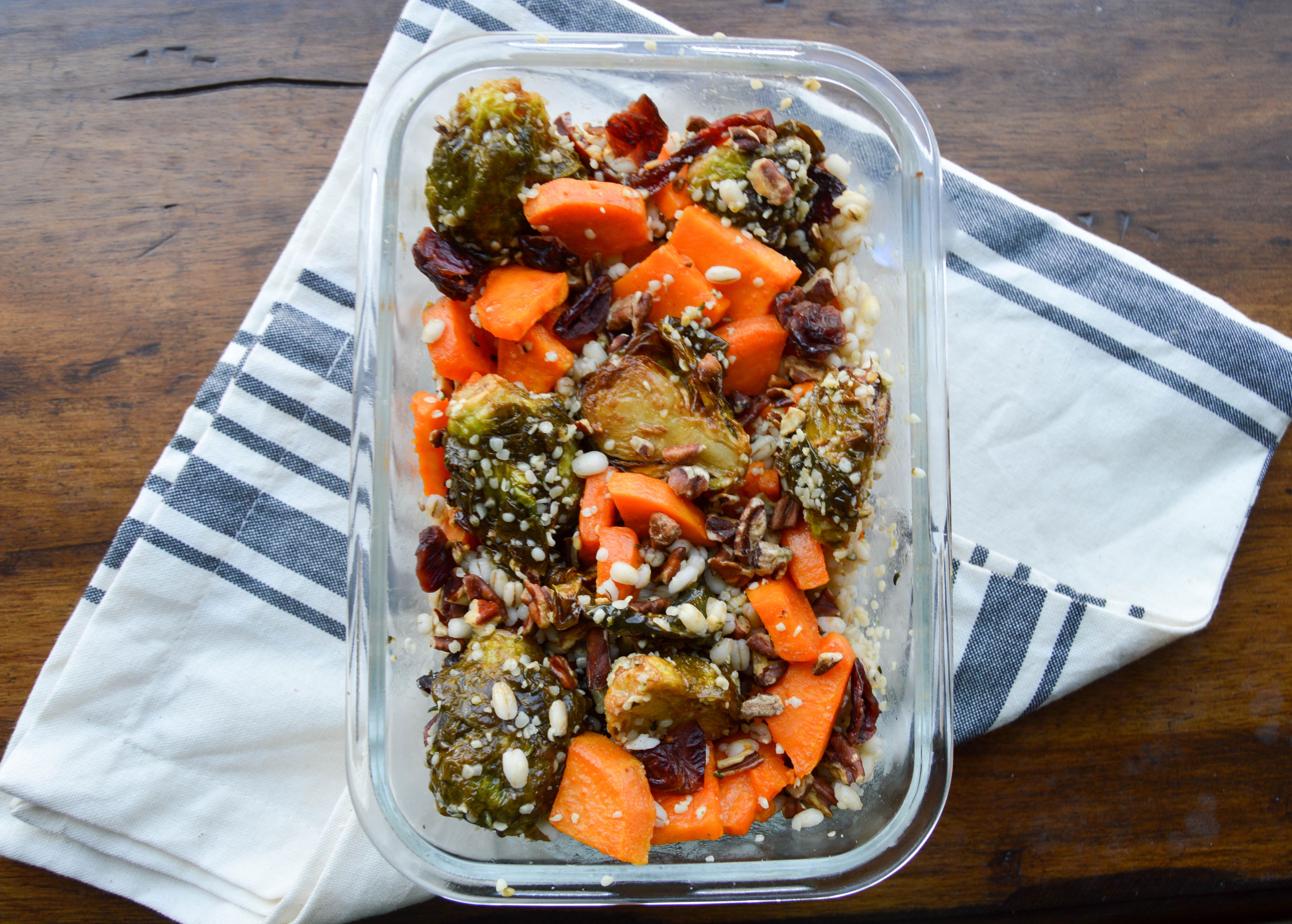 A colorful & healthy fall salad with the leftover brussel sprouts, roasted sweet potatoes, barley, dried cranberries, walnuts, and a cranberry vinaigrette.