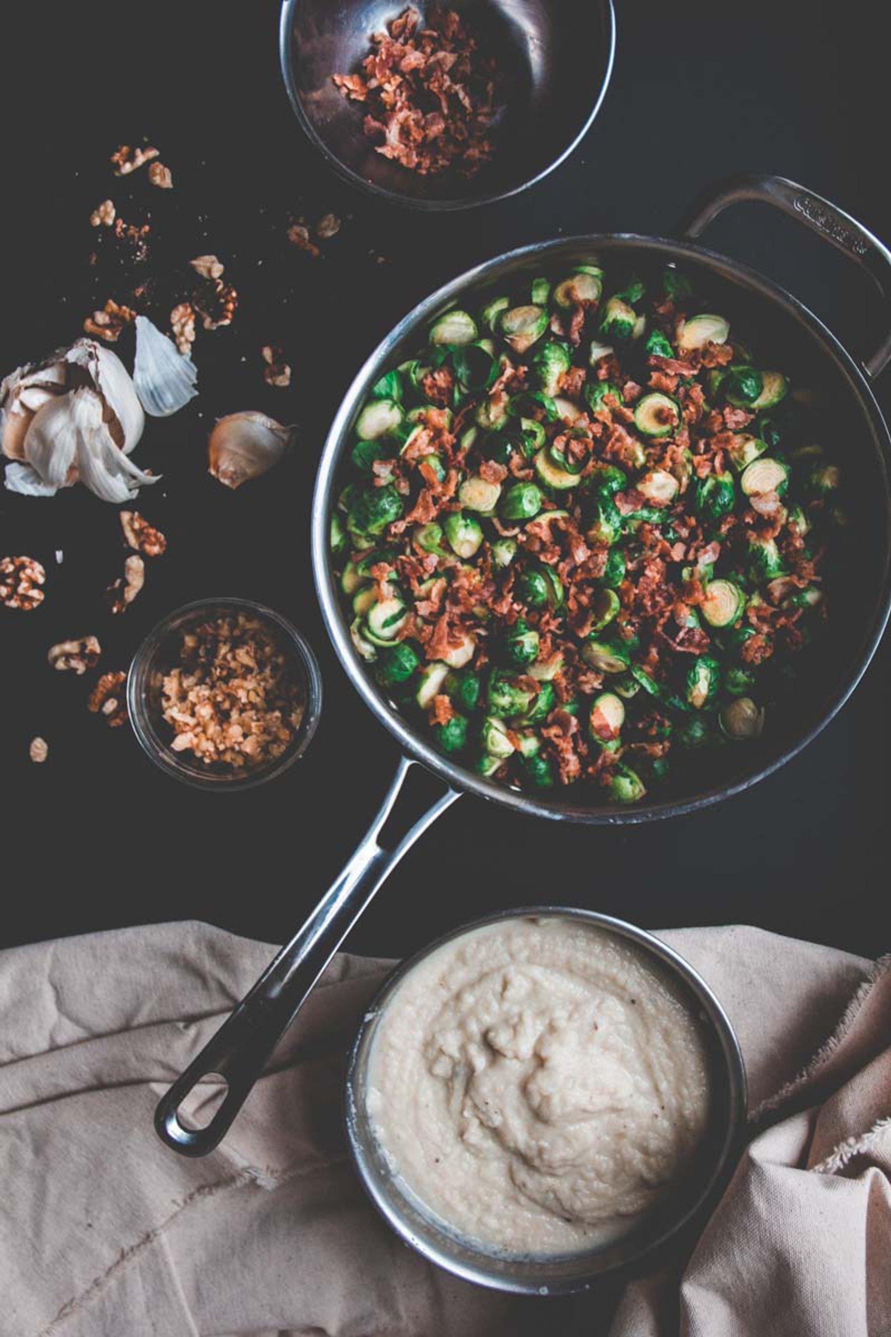 Brussel Sprouts and Bacon Gratin with Creamy Cauliflower Sauce