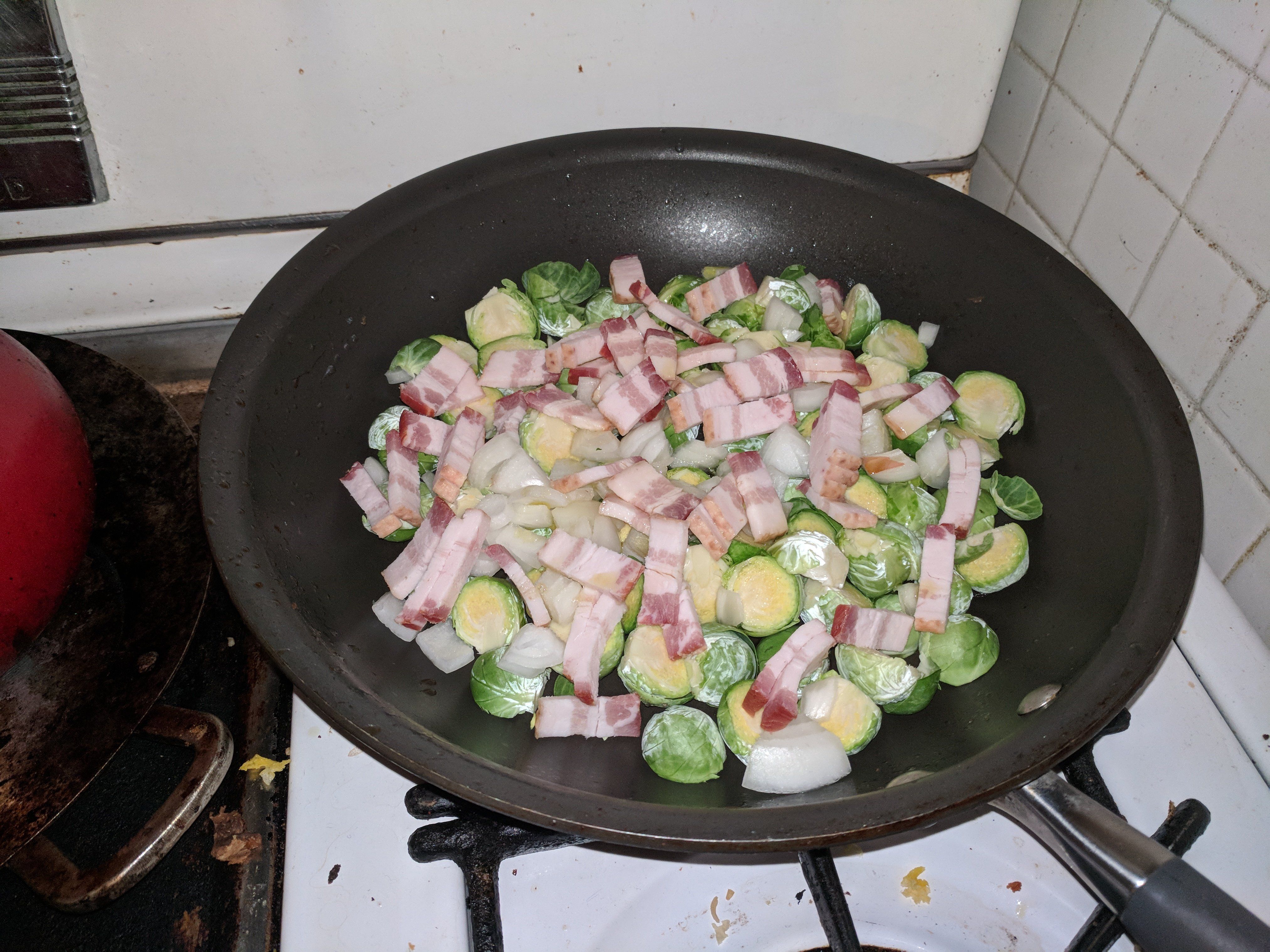 Cut the brussel sprouts in half, removing the out layer (the outer layer has the strongest cabbage style flavors). Include a chopped onion and bacon cut...