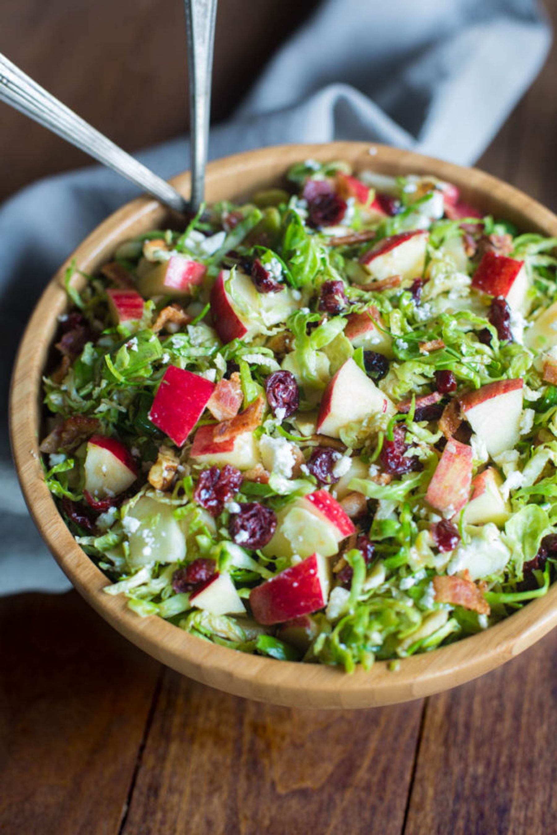 Brussels Sprout Salad with Cranberries and Pecans, chopped apples and feta cheese with a maple balsamic vinaigrette. This sweet and tangy salad is always a crowd favorite!