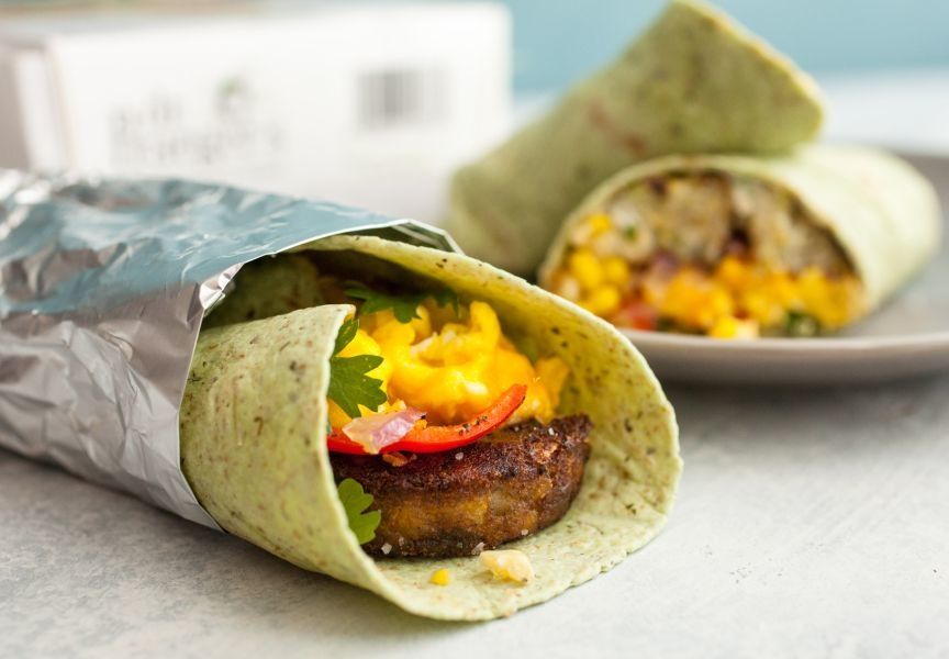 These quick breakfast burritos feature Brussel Sprouts Cakes, soft scrambled eggs, and sauteed veggies. A perfect way to start the day!