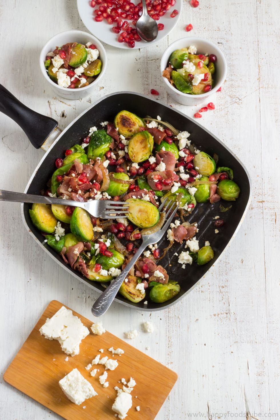 This roasted Brussels sprouts salad with prosciutto, pomegranate and Feta cheese makes a great side dish on your Holiday table!