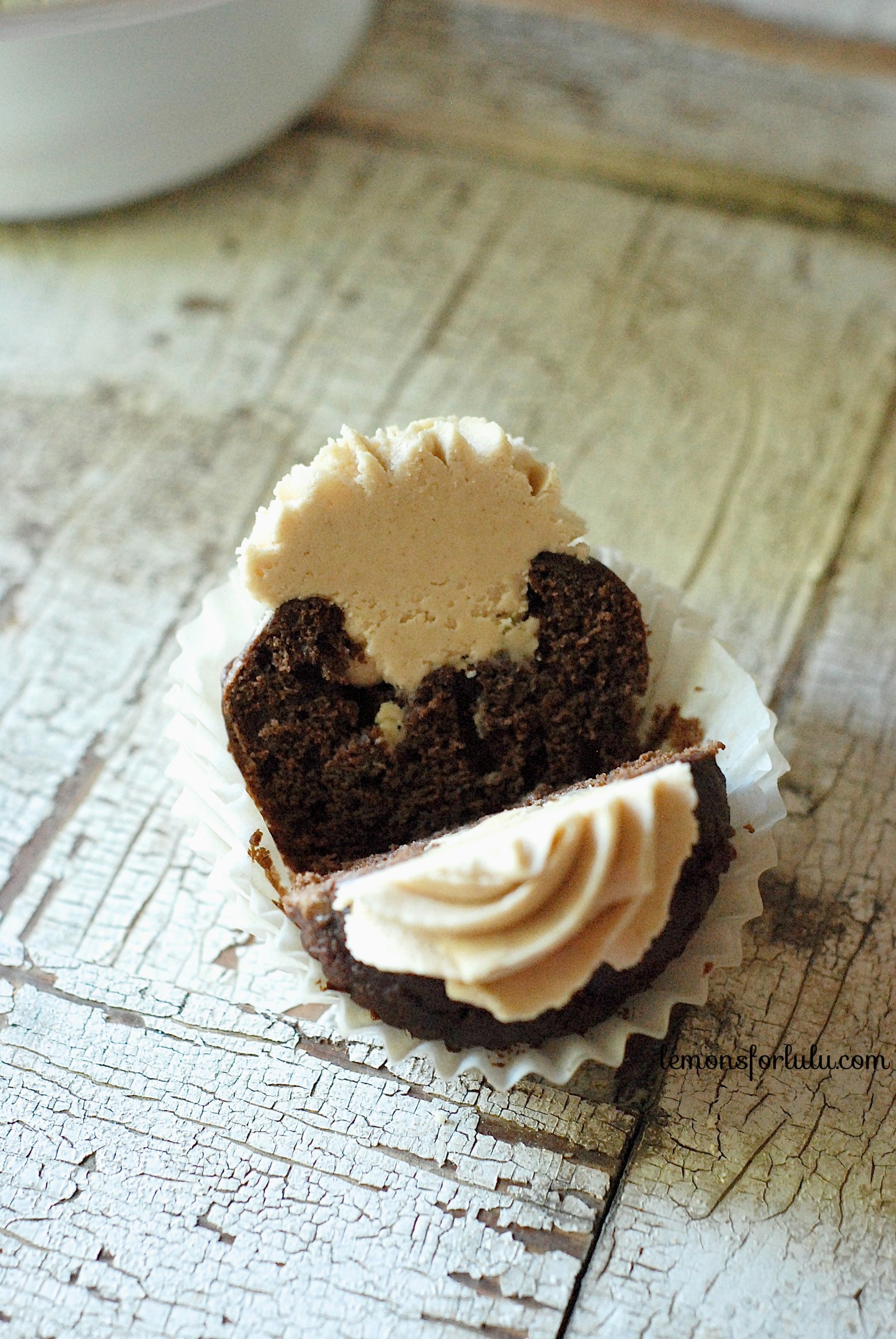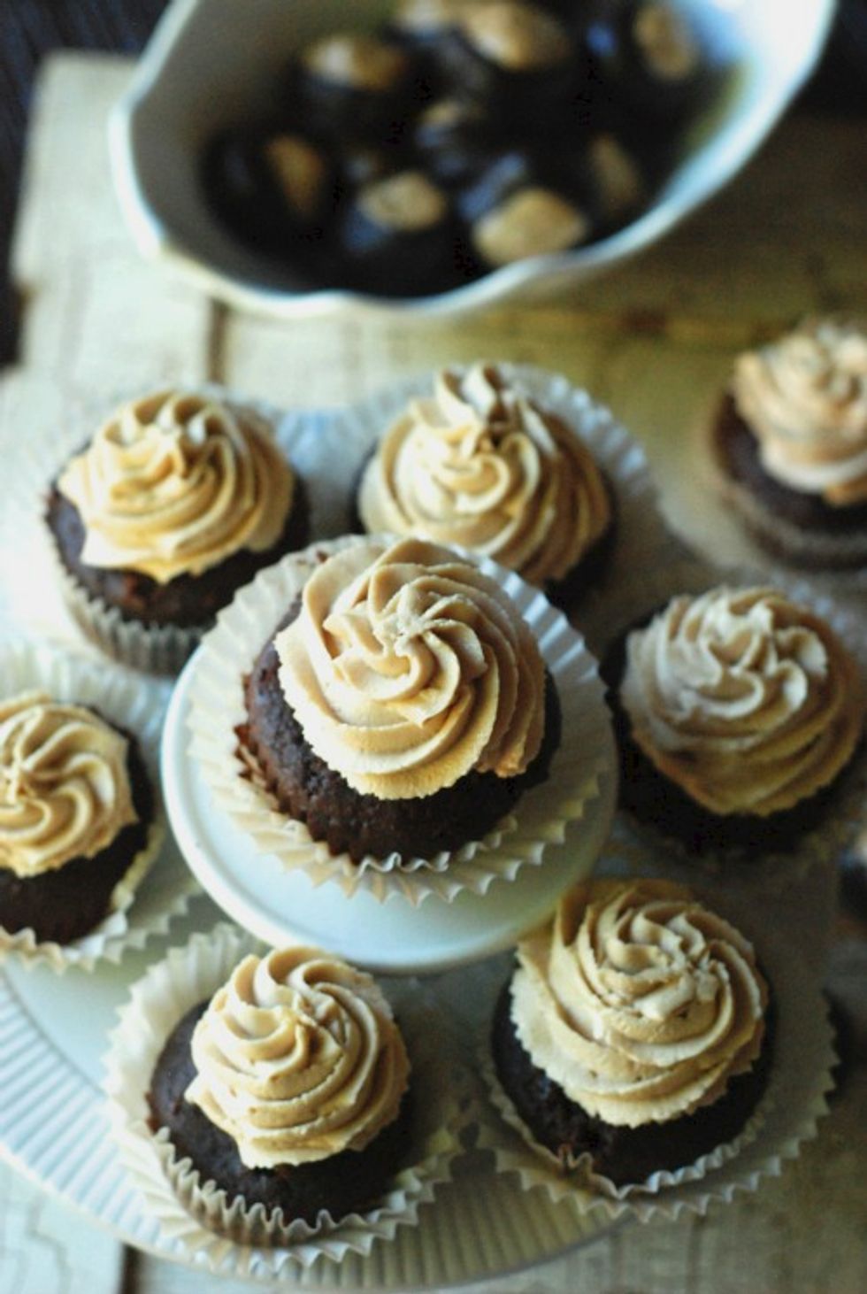 Chocolate cupcakes filled and frosted with a creamy peanut butter buttercream