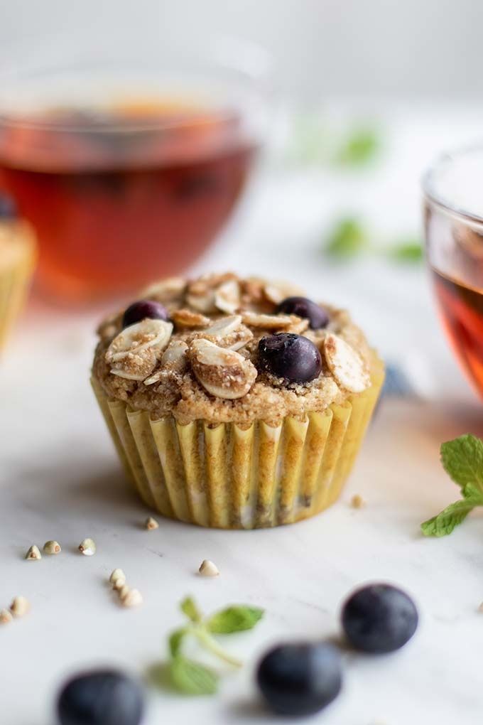 Enjoy these healthy gluten free Buckwheat Blueberry Muffins with a delicious almond stuesel topping. These muffins are high in protein and fiber, and low in sugar, but bursting with earthy flavors. If you love buckwheat, these muffins are for you!