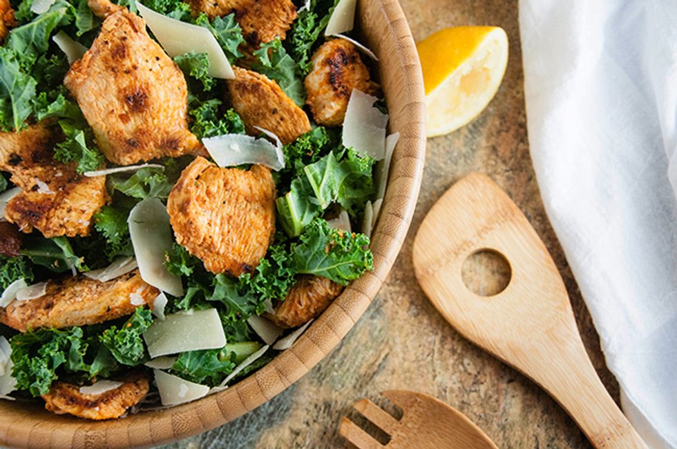Buffalo Chicken Caesar Salad with Kale & Parmesan Cheese Crisps