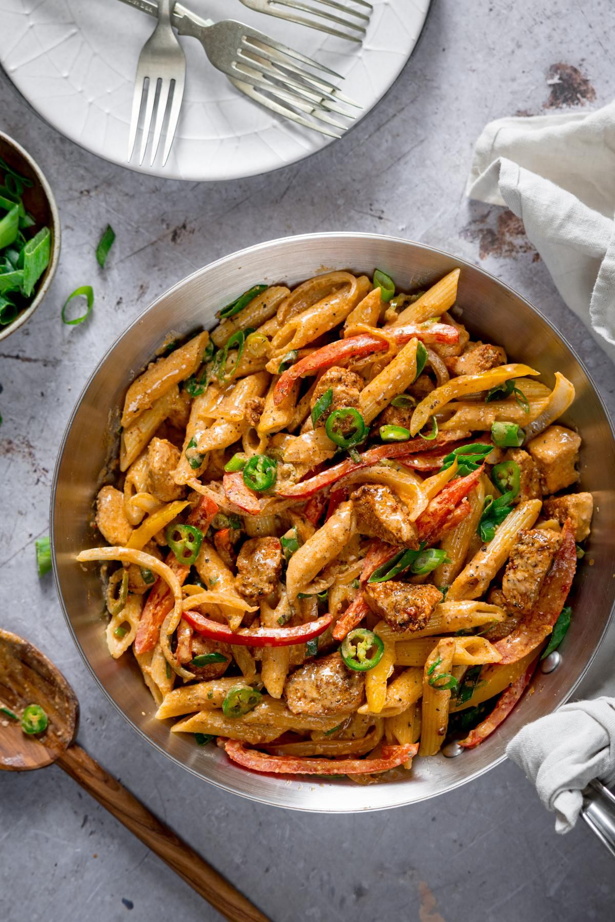 Cajun spiced chicken with pasta and peppers in a tangy, creamy hot sauce. An easy 20 minute dinner, packed with loads of flavour.