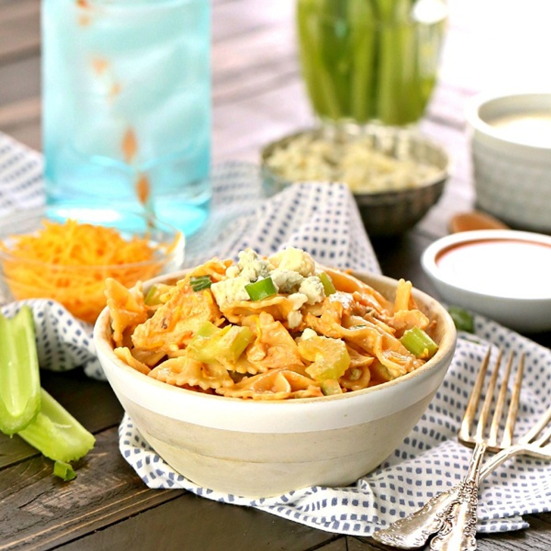 Buffalo Chicken Pasta Salad, the perfect fun and spicy side for BBQs this Summer!