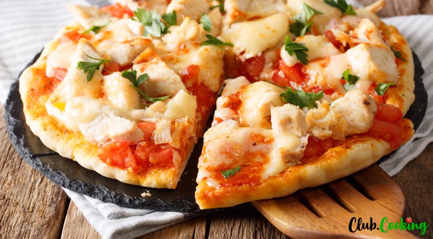 This recipe for the buffalo chicken pizza is phenomenal. Ranch flavor infused cream cheese serves as a creamy sauce spread on a homemade pizza dough and topped with mozzarella cheese and chicken tossed in buffalo sauce. It is then baked in the oven and drizzled with even more ranch dressing before serving.