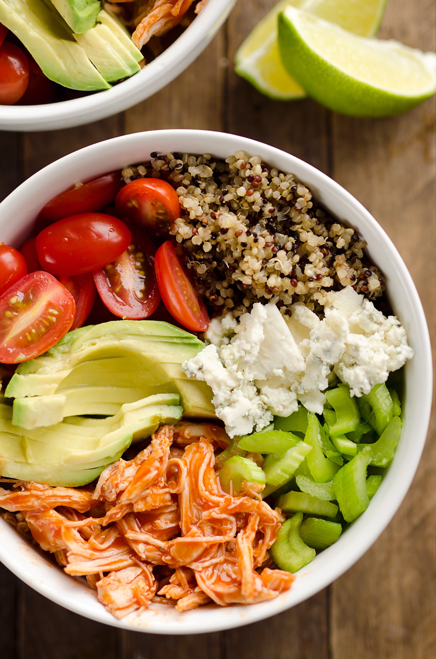 Buffalo Chicken & Quinoa Veggie Bowls are a light and healthy dinner recipe loaded with wholesome vegetables and grains, shredded chicken tossed in spicy buffalo sauce and bleu cheese crumbles for amazing flavor!