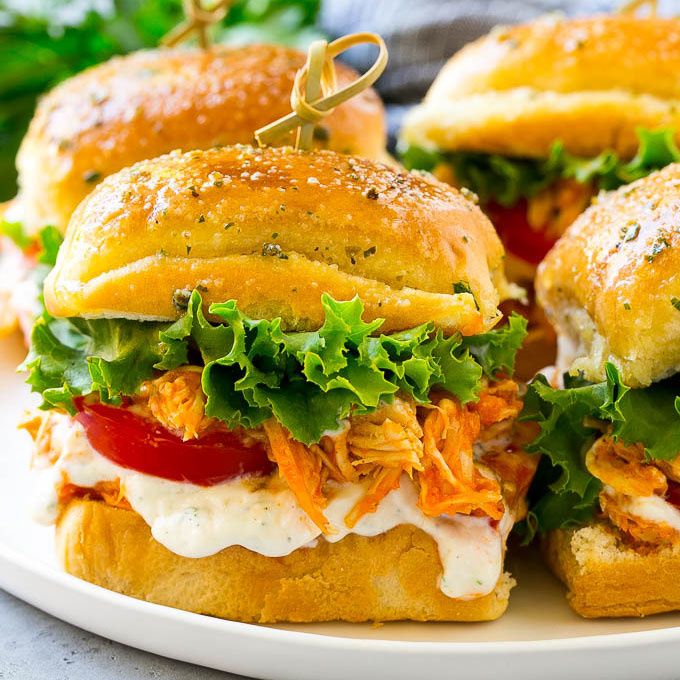 These buffalo chicken sliders are warm sandwiches filled with shredded buffalo chicken, ranch sauce, lettuce and tomato. The ultimate party snack!