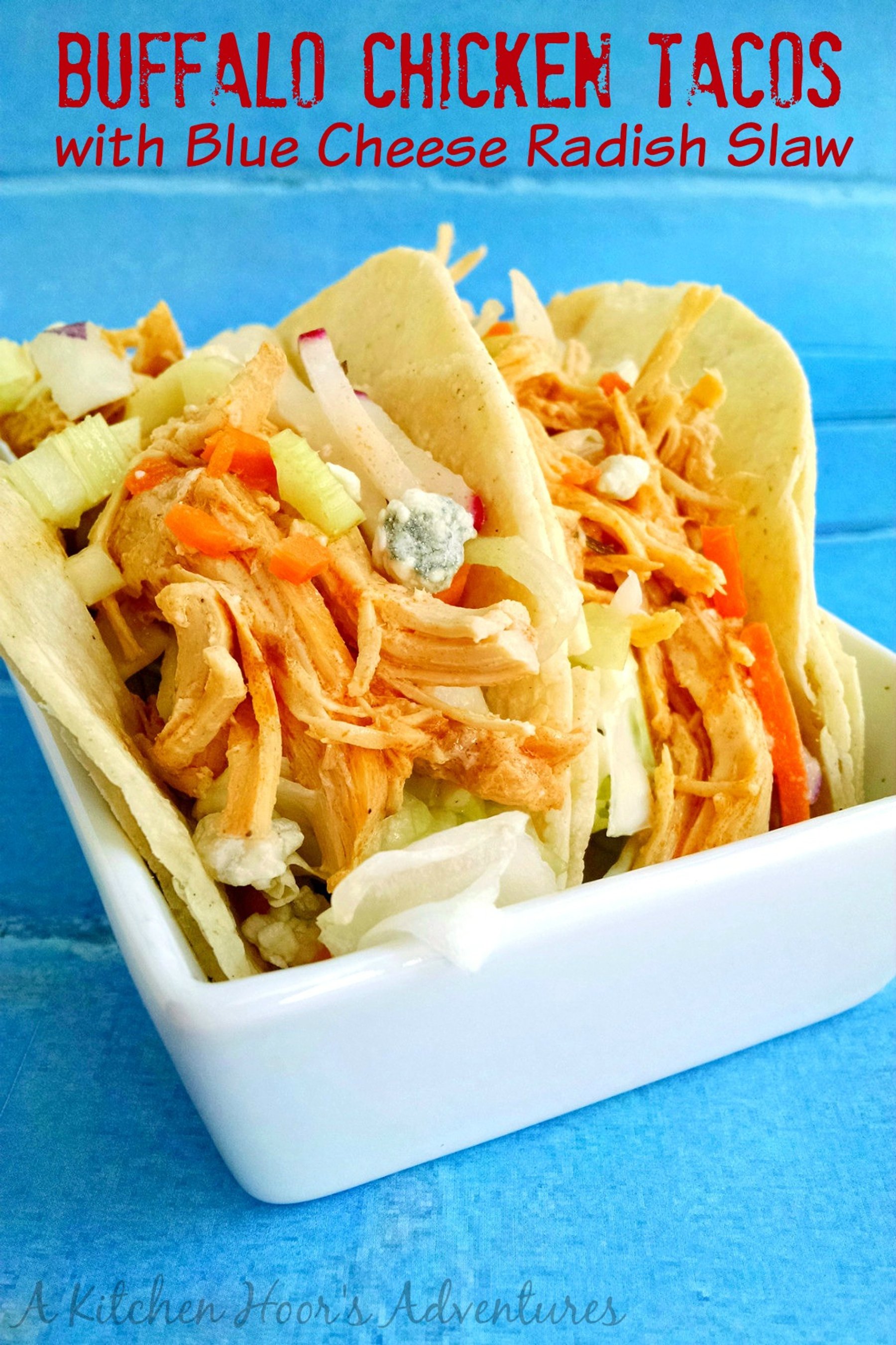 Delicious Buffalo style chicken sits atop crunchy, tangy coleslaw made of radishes and cabbage with a blue cheese infused coleslaw dressing. These tacos will knock your taste buds off! And your family will want these ALL time. Don\\\'t say I didn\\\'t warn you!