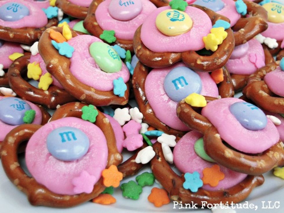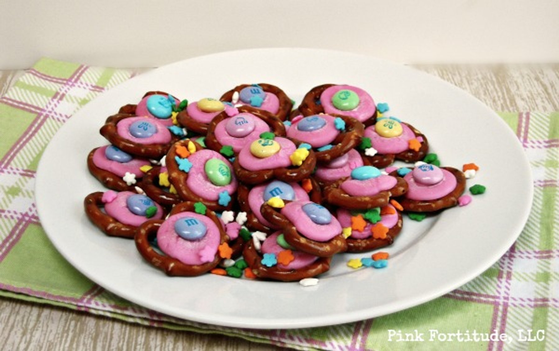 Put melt on pretzel and in oven at 250 degrees for 4-5 minutes. Take out and add M&Ms and sprinkles.