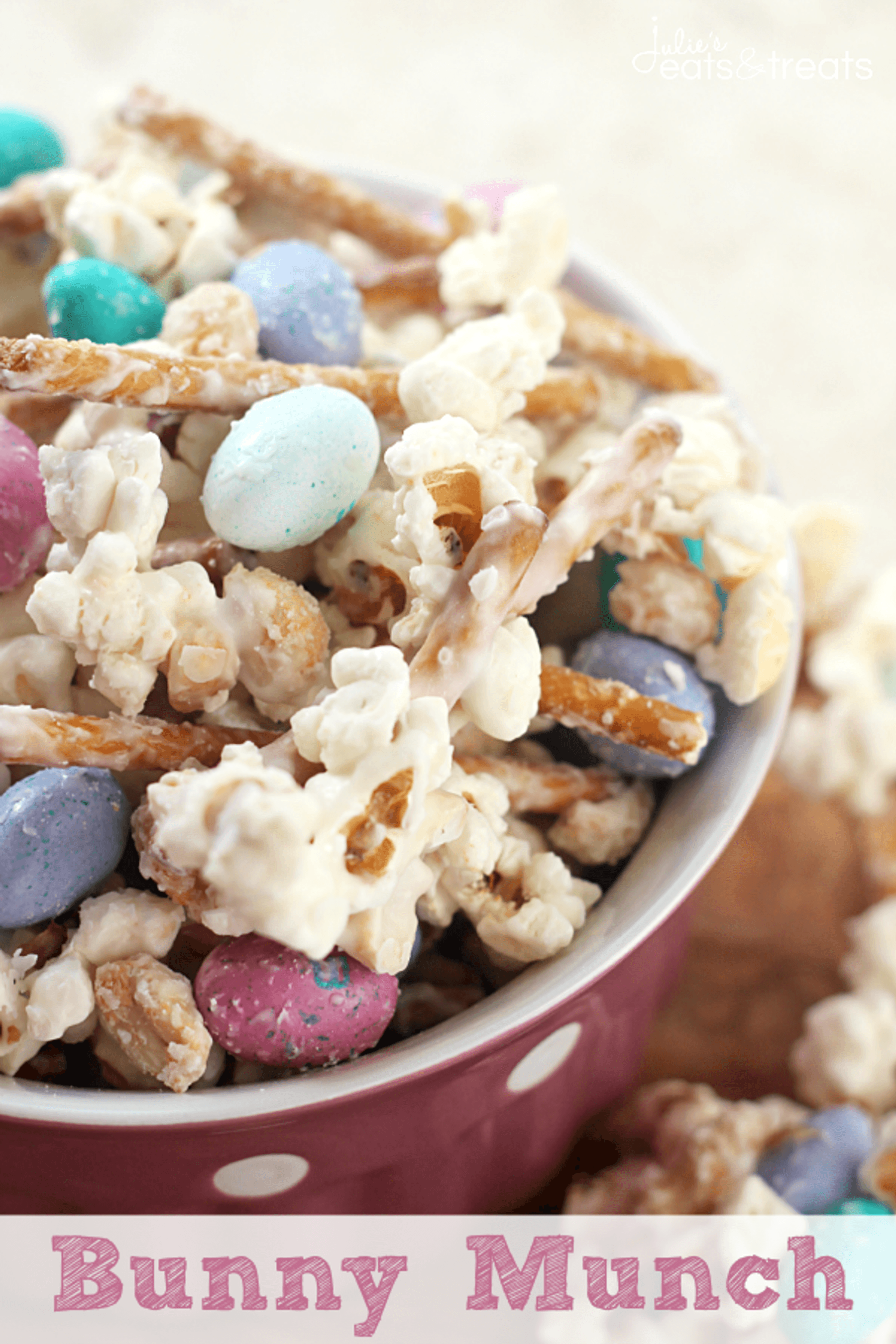 Bunny Munch ~ Sweet & Salty Snack Mix Loaded with Popcorn, M&Ms, Pretzels and Peanut then coated in a Vanilla Candy Coating!