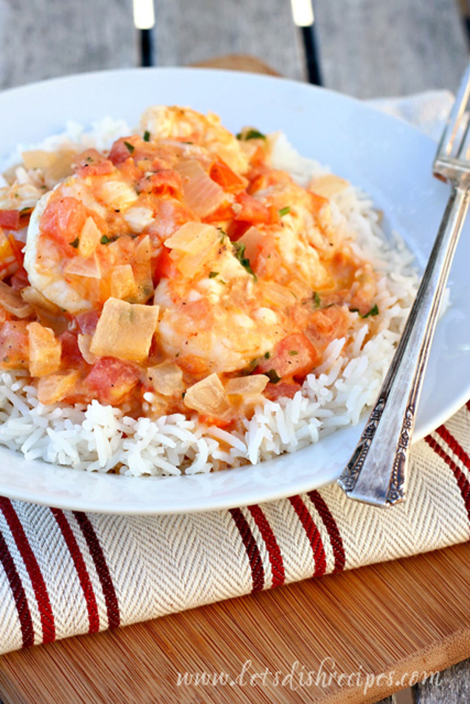 Combine the garlic, salt, pepper, spices and lime juice. Pour over shrimp in a shallow container or Ziploc bag and marinate for at least two hours. Saute the onion in the butter until soft. Add the tomatoes...