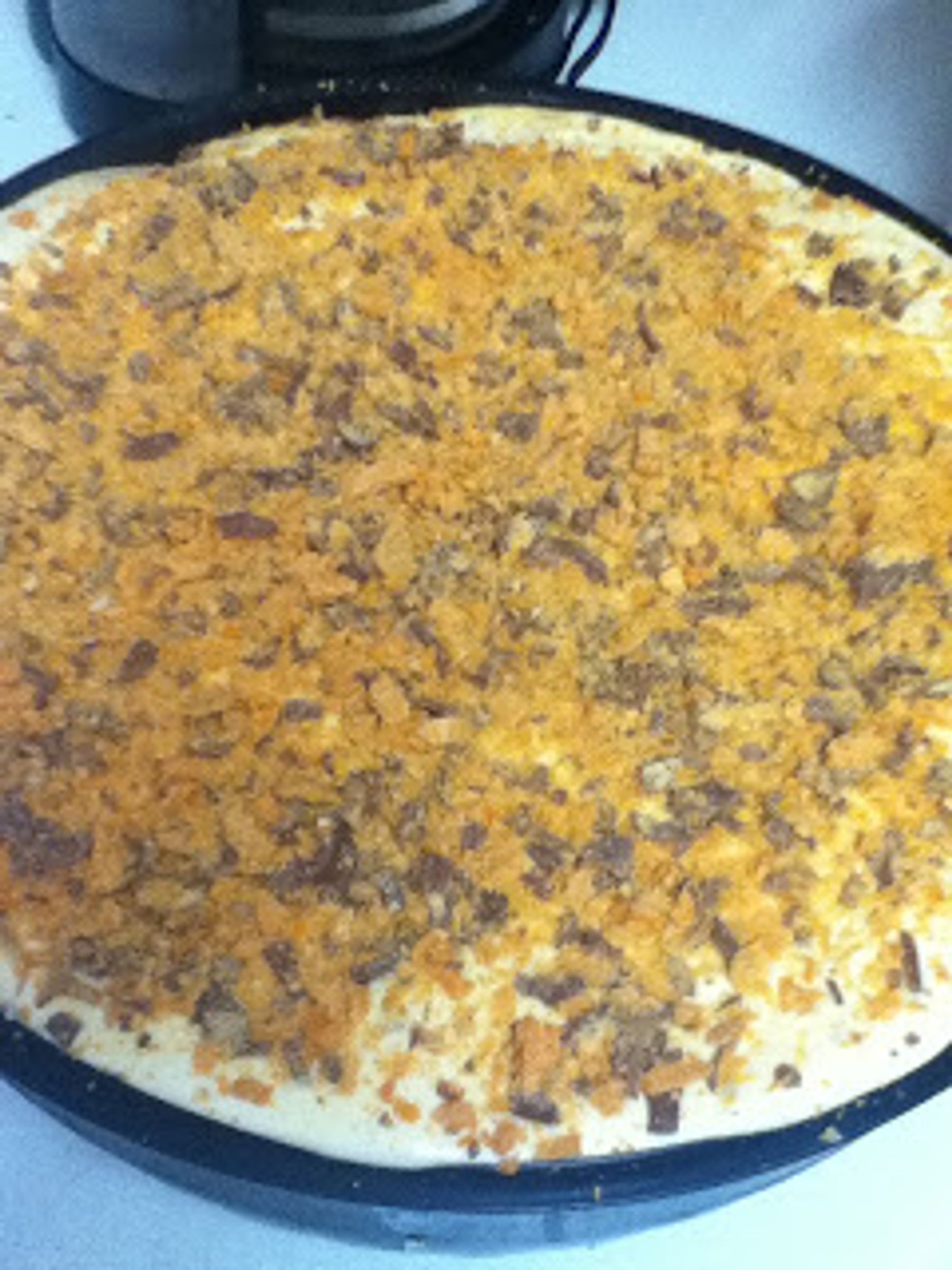 Combine milk and pudding mix. Crush candy bars and add to pudding mix ( you can reserve some for garnish). Fold in Cool...