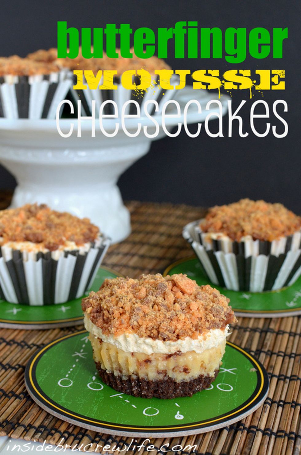 Butterfinger cheesecake topped with a Butterfinger mousse