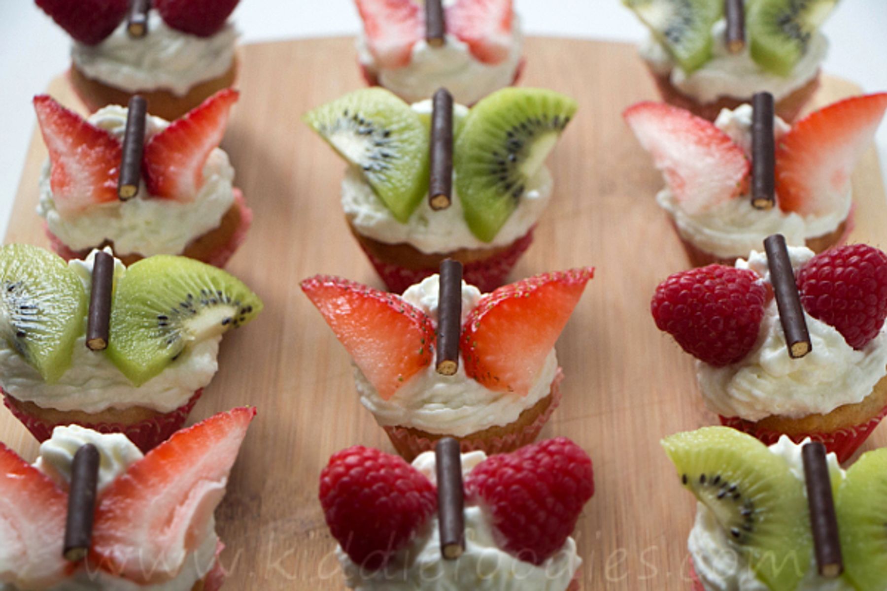 Delicious mini muffins with bananas and chocolate chips. Decorated with whipped cream and cute butterflies made of fruits and chocolate biscuit sticks.