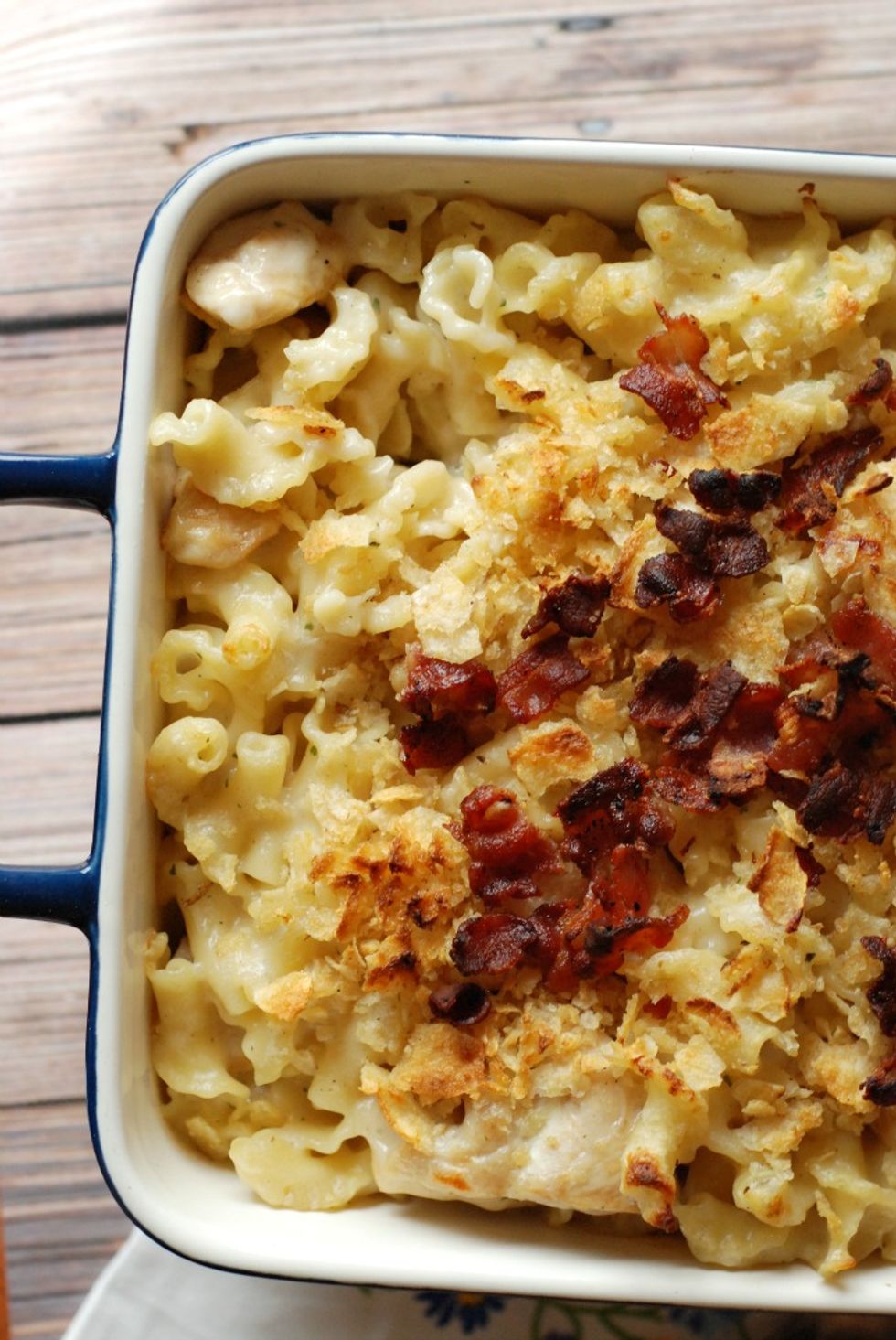 This cheesy baked pasta has lots of tangy buttermilk, chicken, bacon and a perfectly crunchy topping!