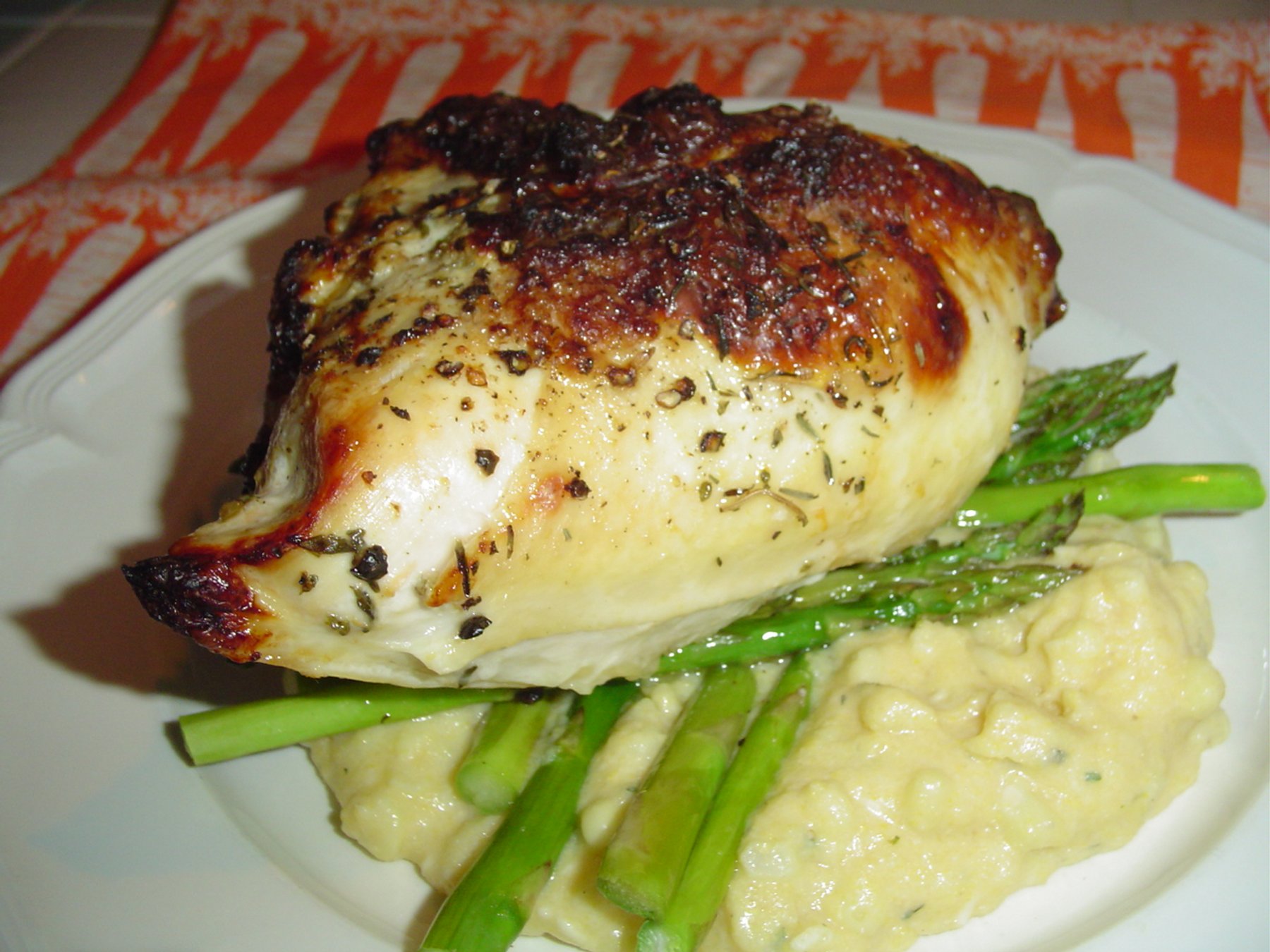 Fresh Thyme and lemon make this chicken sing but the buttermilk seals in the juices and tenderizes the chicken. This crispy chicken was a delicious ending to a beautiful fall Sunday. I served my chicken with oven roasted asparagus and polenta with fresh corn, thyme and parmesan cheese.