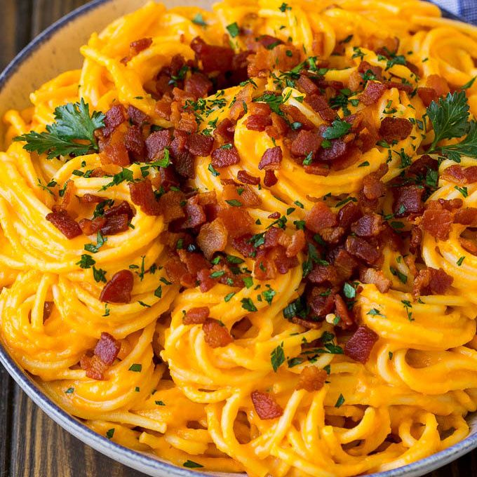 This recipe for butternut squash pasta is spaghetti tossed in a creamy butternut squash sauce, then topped with bacon and herbs. An easy and delicious dinner that's perfect for fall!