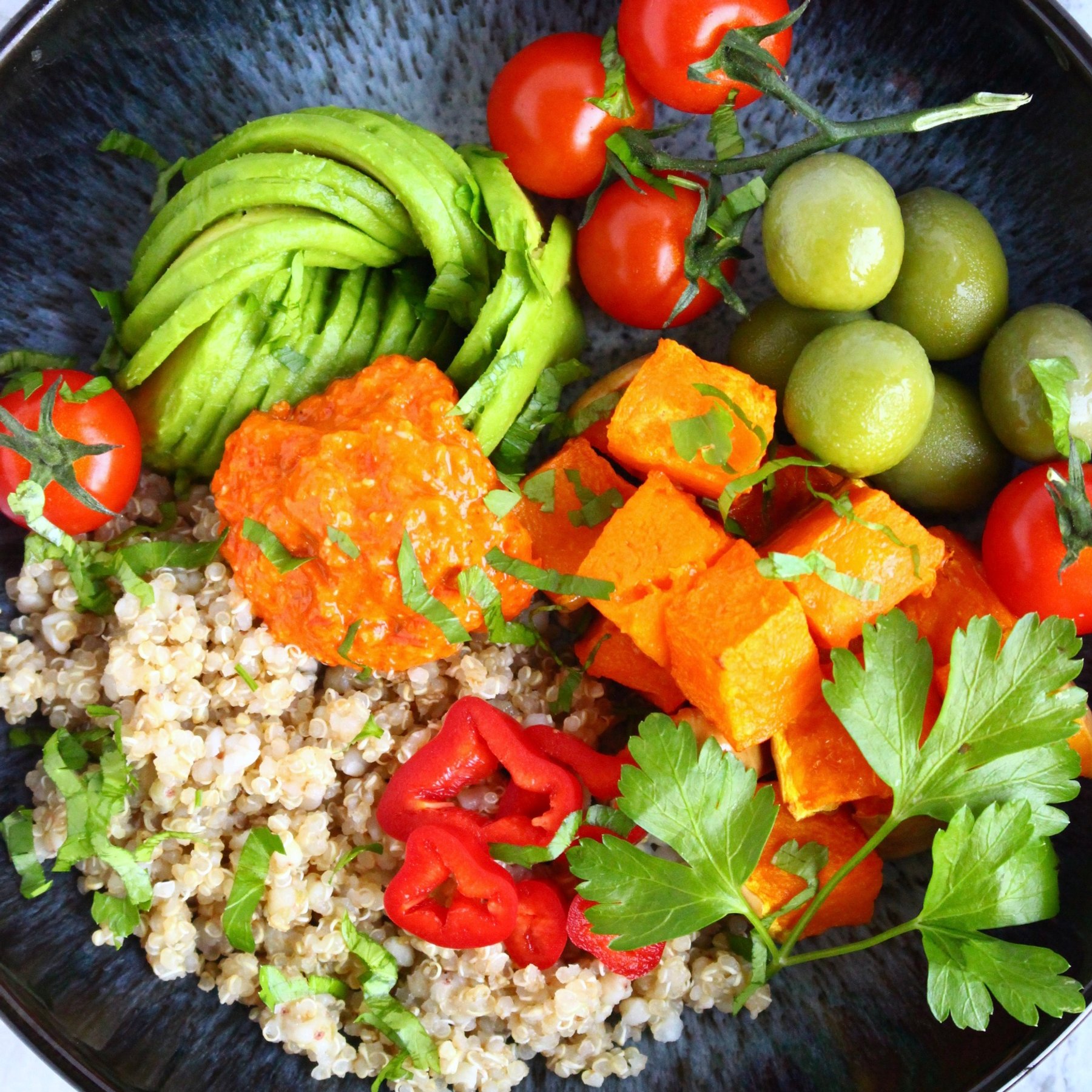 http://www.rhiansrecipes.com/2016/08/10/butternut-squash-quinoa-bowl-roasted-red-pepper-sauce-vegan-gf/