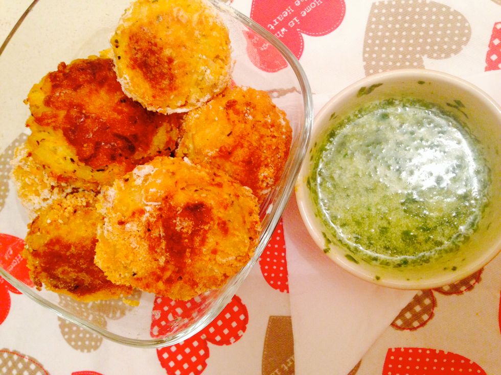 Cheesy butternut squash balls (baked!) and served with parsley dip!