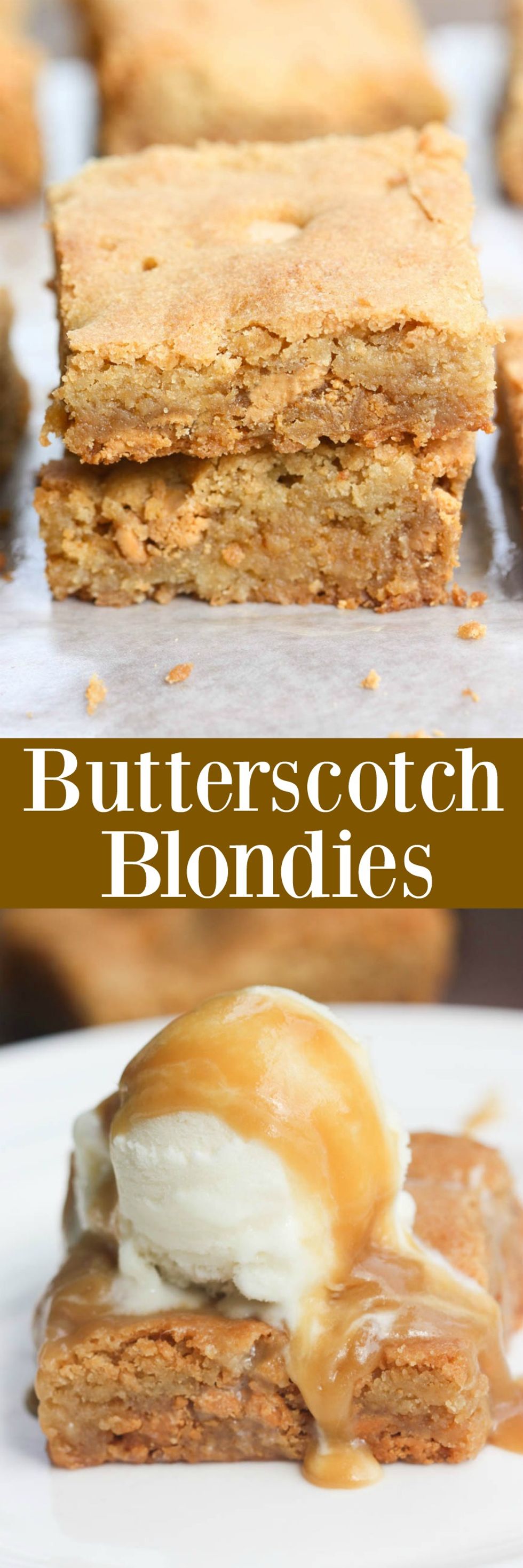 Chewy homemade blondies with butterscotch chips. These Butterscotch Blondies are the BEST, especially served with ice cream and an easy homemade butterscotch sauce.