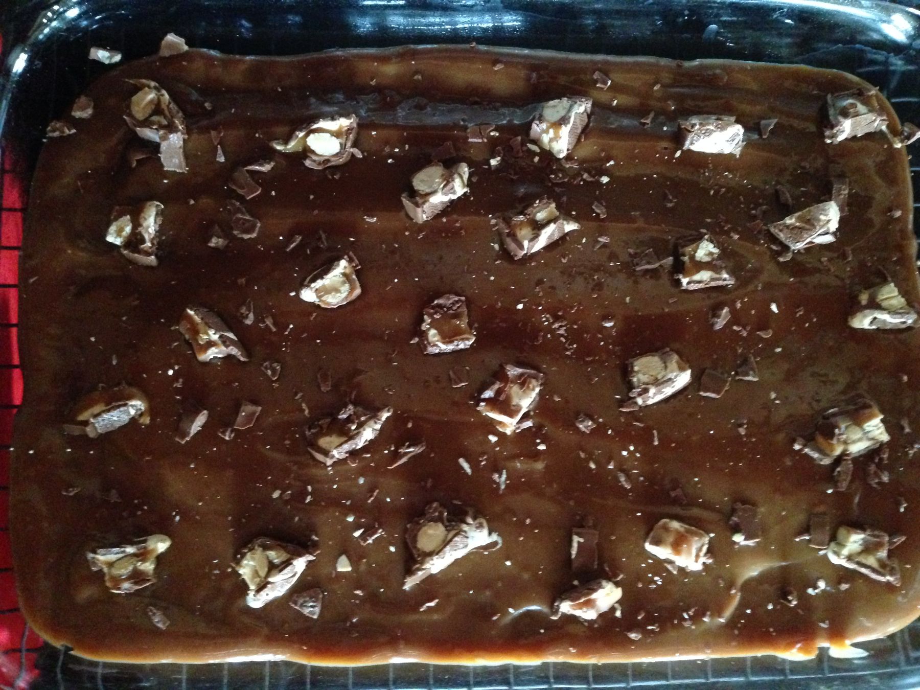 3. Pour the creamy mixture over the top of the cooled brownies. Immediately top with chopped snickers. Allow icing to set. Cut into squares and serve.