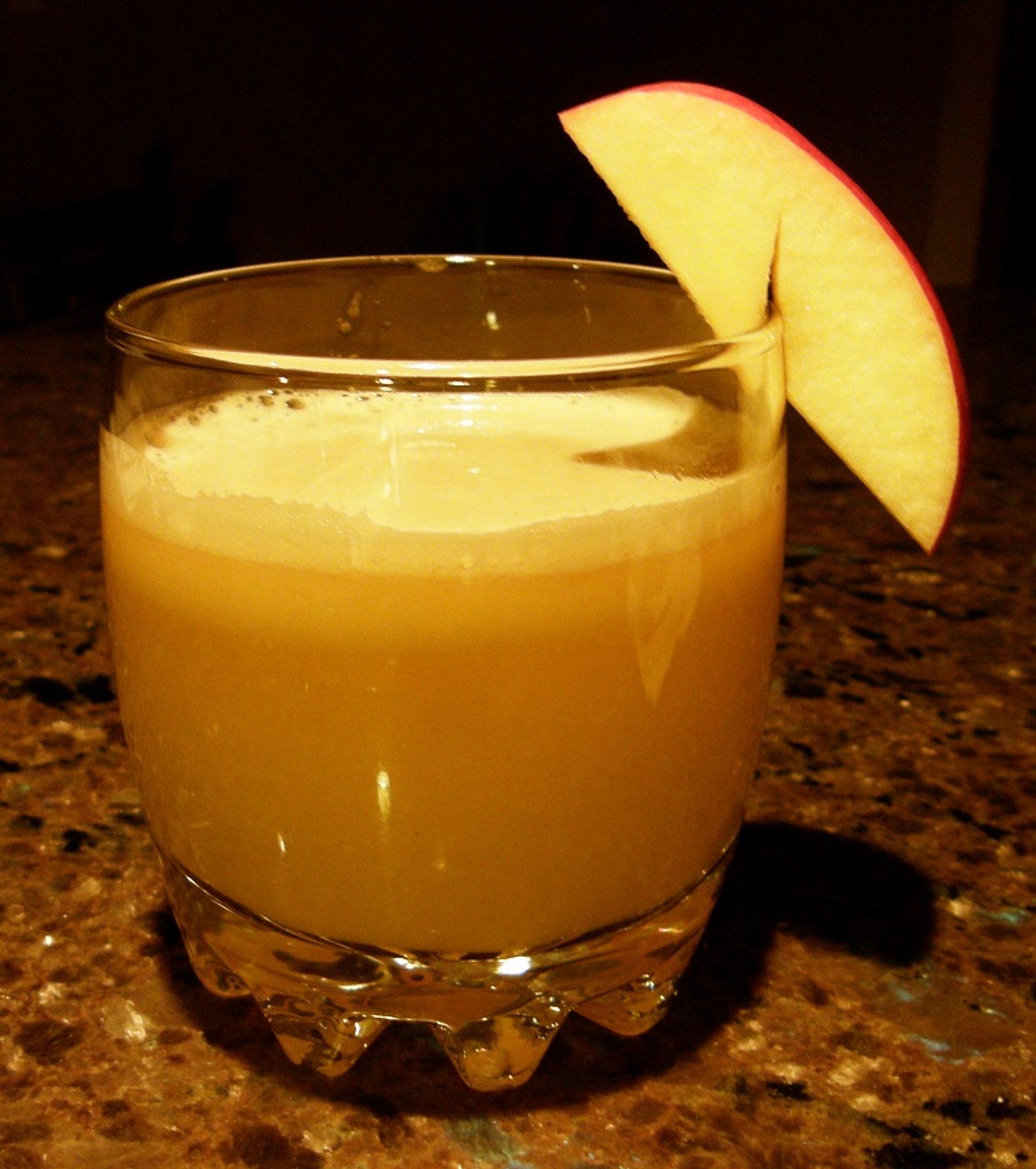 (Optional) Use the apple slice saved earlier step to garnish. Make a diagonal cut at in the middle of the slice, then hang it on the glass rim.