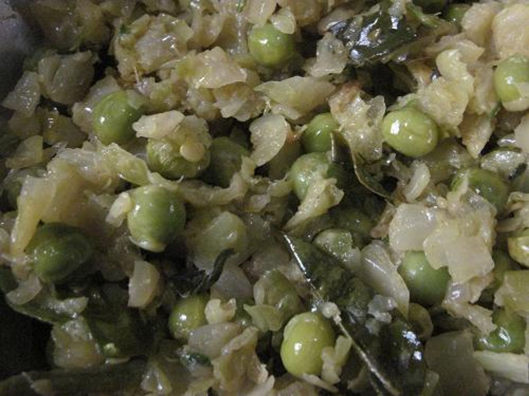 heat pan add 4-5 tbsp oil ,once oil get heated add chopped green chilli slices ,curry leaves and onions into it and small amount of salt into it. once onions turn into golden brown . later add ginger garlic paste and saute them in 2minutes.later add turmeric powder and green peas fry them for 4 minutes.later add cabbage to it cook until water gets absorbed and fried well and check salt and added as per their taste and wish.