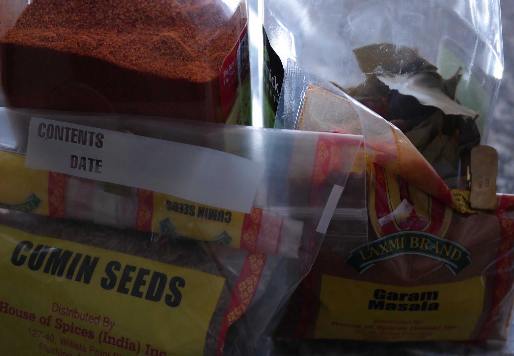 2. In a wide frying pan, heat oil over medium high heat. When hot, put in cumin seeds and bay leaves. As soon as the bay leaves begin to take on color (should take a few seconds), add cabbage and peas, and stir for 30 seconds.