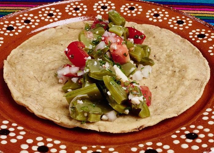 Recipe for a delicious, easy to prepare, healthy, vegetarian Mexican cactus salad (nopal or nopalitos salad).