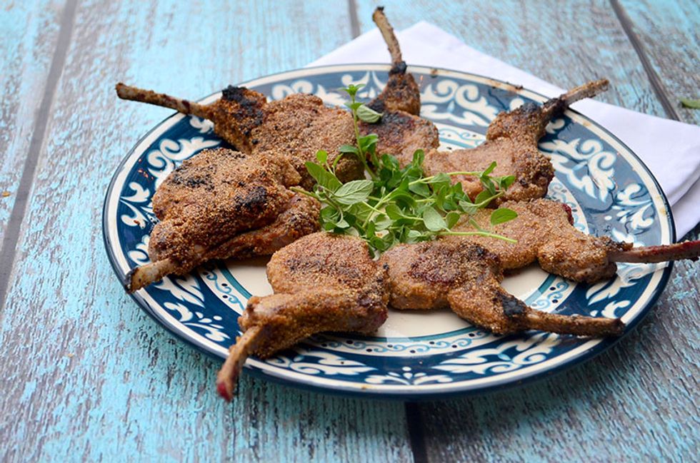 Press the seasoned cornmeal into the lamb chops until completely covered.