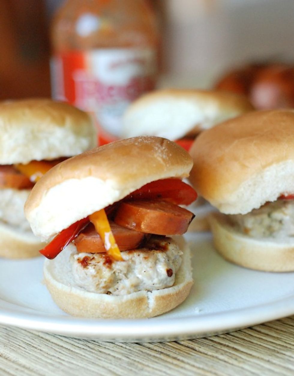 Mini pork patty's topped with sauteed bell peppers and sliced andouille sausage.