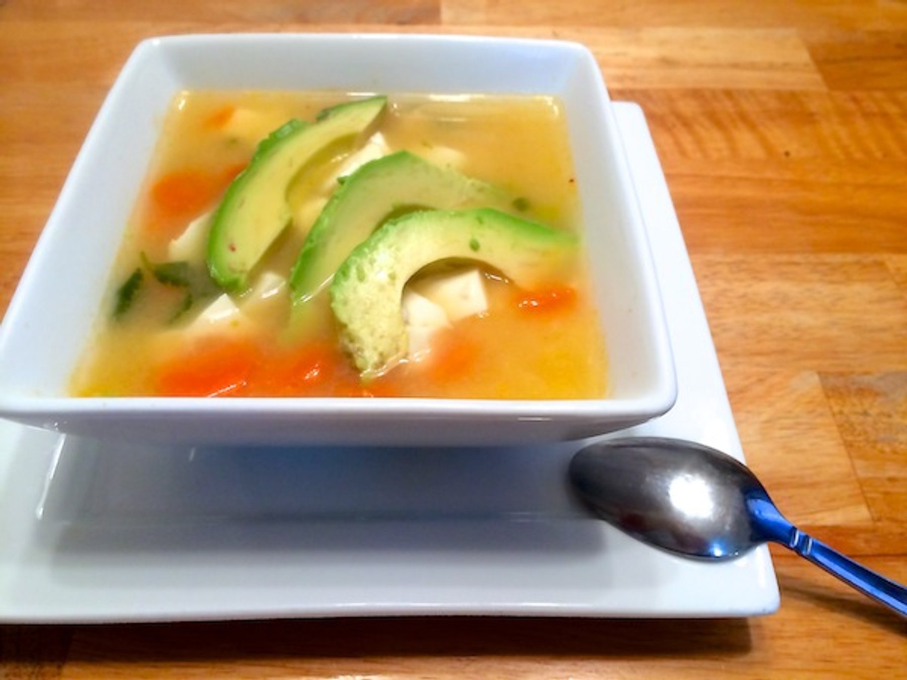 A delicious chicken chipotle soup served with avocado and white cheese. Perfect for those who like a little spice in their food.