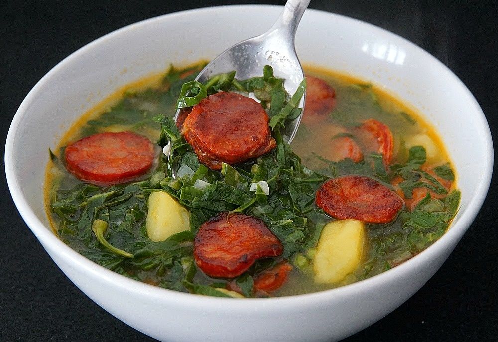 | Caldo Verde is a popular Portuguese Soup recipe whose name translates simply to "green broth." The soup is actually more complex, featuring hearty green kale, blended potatoes and spicy smoked sausage. |